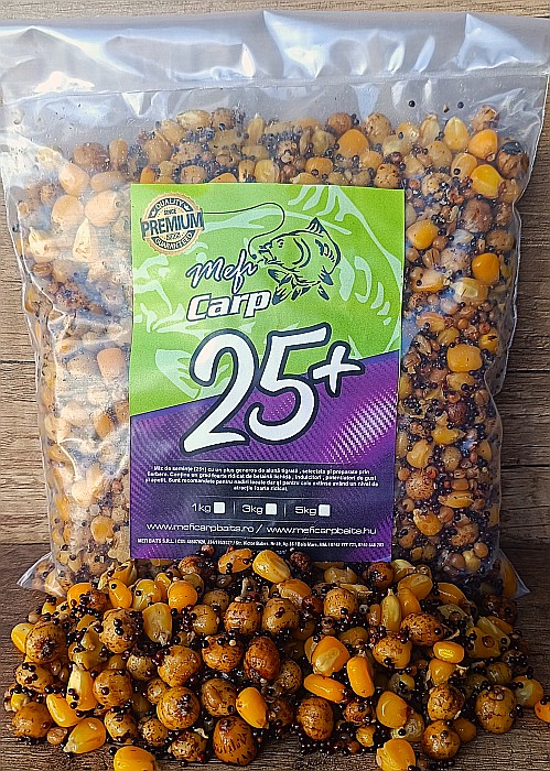 Amestec de cereale atent selecționate, preparate prin fierbere, pentru o digerabilitate ridicată. Mixul se află în stare naturală, fără arome adăugate, dar este îmbogățit cu: potențiatori de gust și apetit, palatanți și îndulcitori. Față de alte variante, Mixul 25+ conține o cantitate generoasă de Alune Tigrate , un ingredient deosebit de apreciat în pescuitul la crap, datorită texturii sale unice și a atractivității sale puternice.